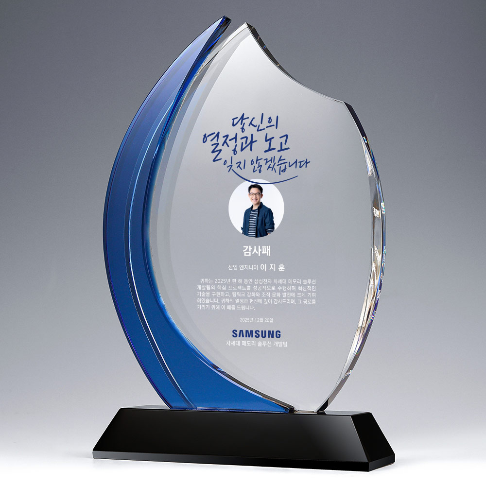 과감한 곡면과 시원한 코발트컬러의 포인트가 인상적인 크리스탈상패입니다. 공로패, 감사패, 기념패, 학위패 등 다양한 용도로 사용되고 있는 크리스탈패입니다.