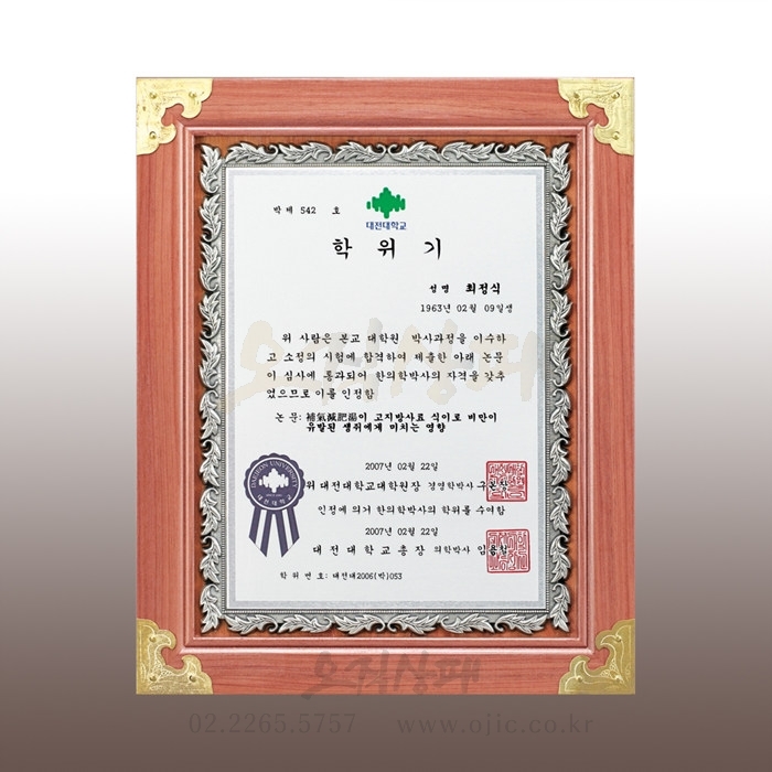 - 향나무 상패 틀에 금속 사출 틀 접목, 알미늄 에칭판 인쇄후 접착
