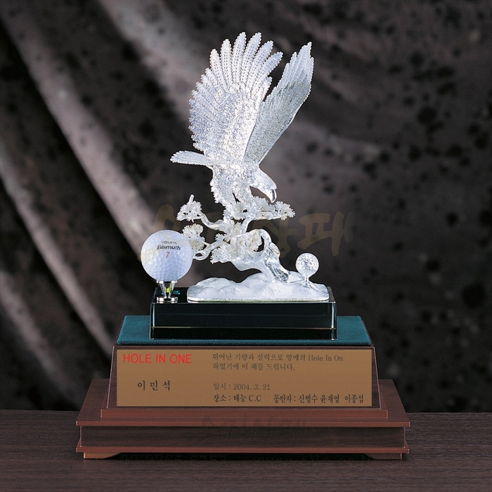 - 독수리 및 소나무를 신주 재질로 금형 사출 후 은도금하였으며, 크리스탈받침에 금속 문안판 접목하였습니다.