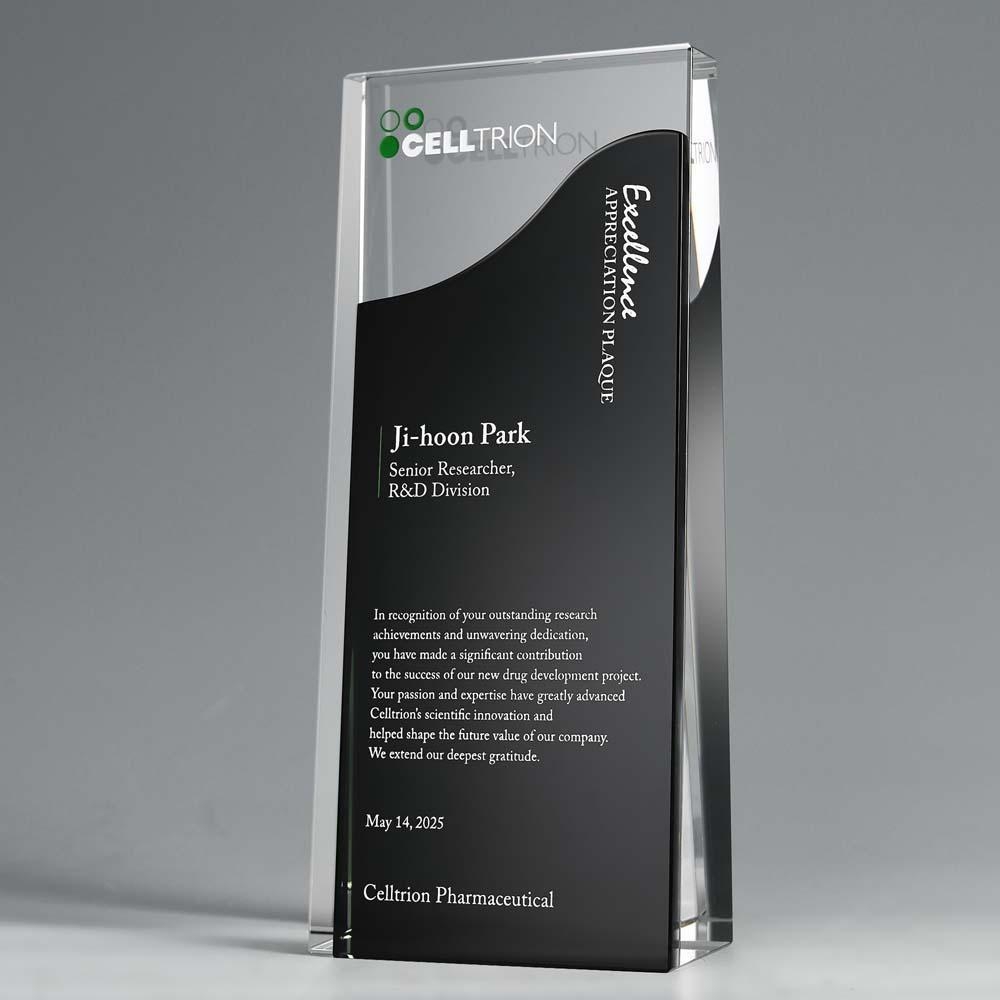 블랙 포인트와 곡선형 물결 디자인이 어우러진 고급 상패입니다. 감사패, 공로패, 트로피, 재직기념패로 활용하기 적합한 현대적 스타일입니다.