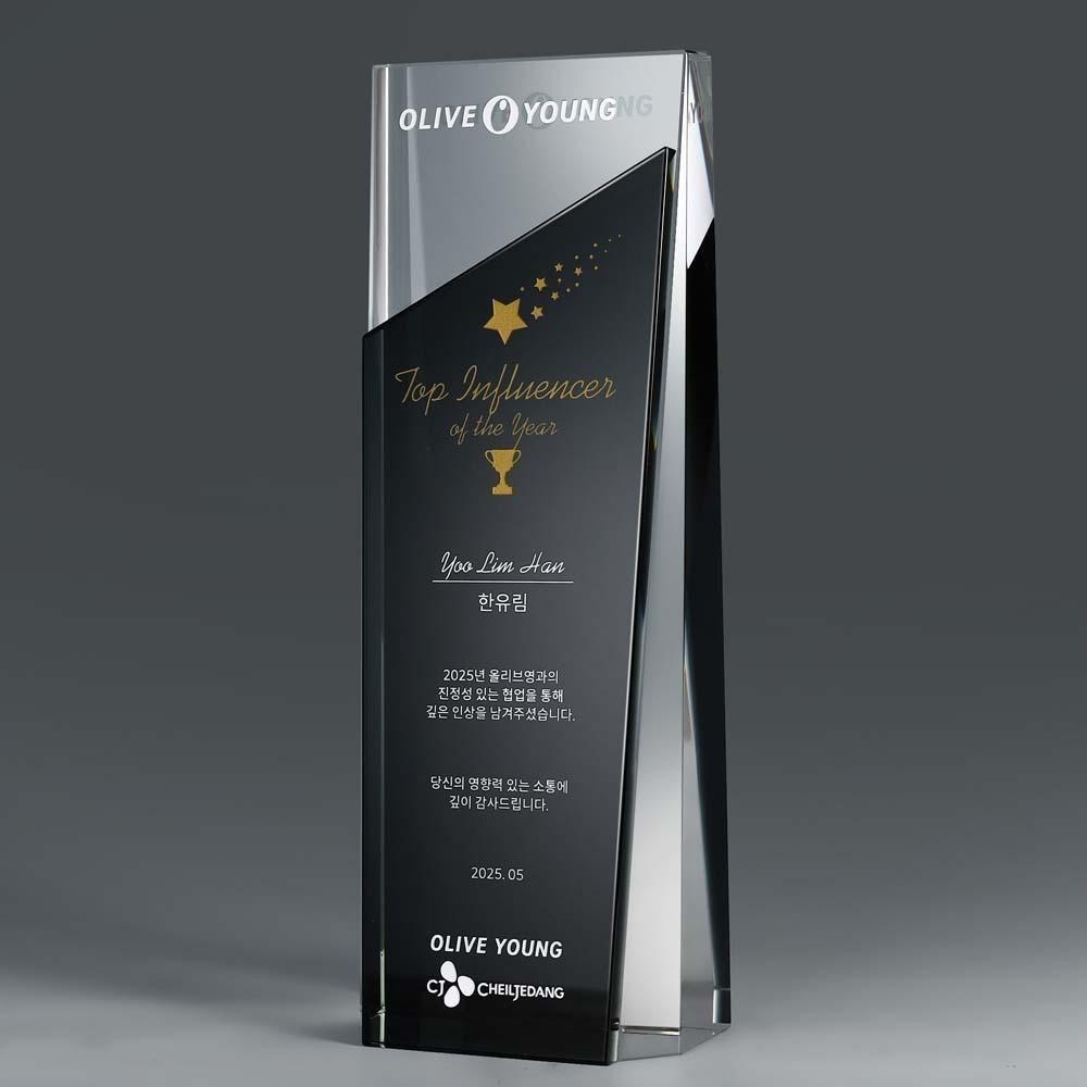 세련된 사선 컷과 고광택 투톤 마감이 돋보이는 트로피형 상패입니다. 공로패, 감사패, 재직기념패 모두에 어울리는 스타일입니다.
