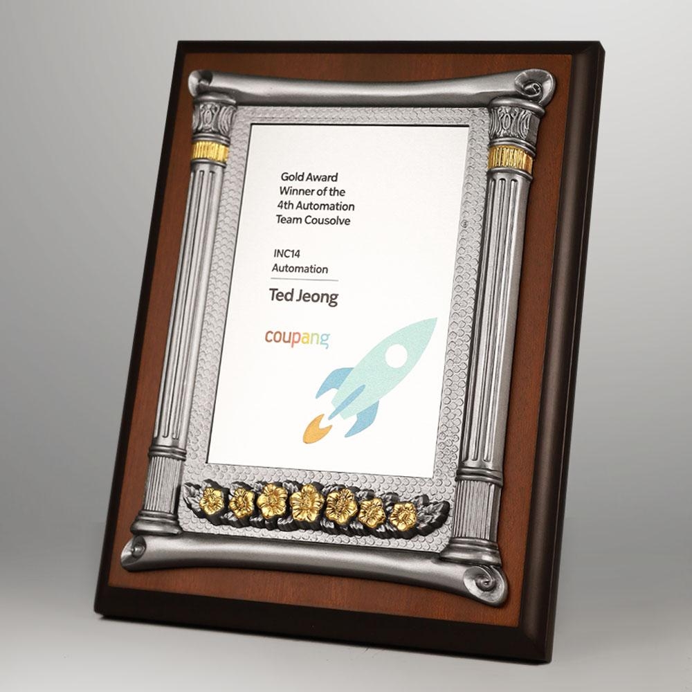 고급스러운 금박 기둥 주석 판넬과 브라운 프레임으로 구성된 평면형 상패입니다. 박사 학위패, 기관 감사패, 전문 인증패로 널리 사용됩니다.