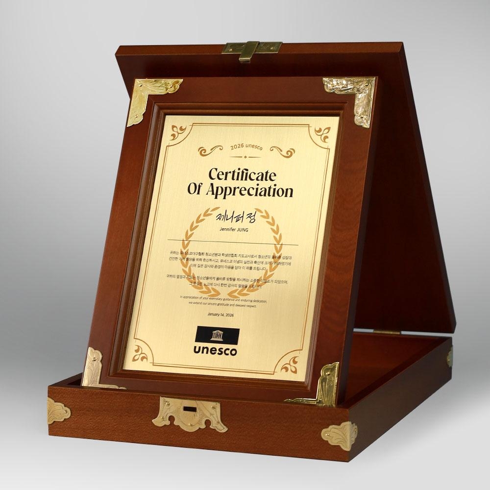 고급 원목 케이스에 전통 금장 장식을 더한 감사패로, 공로패 및 학위패로 많이 사용되는 프리미엄 상패입니다
