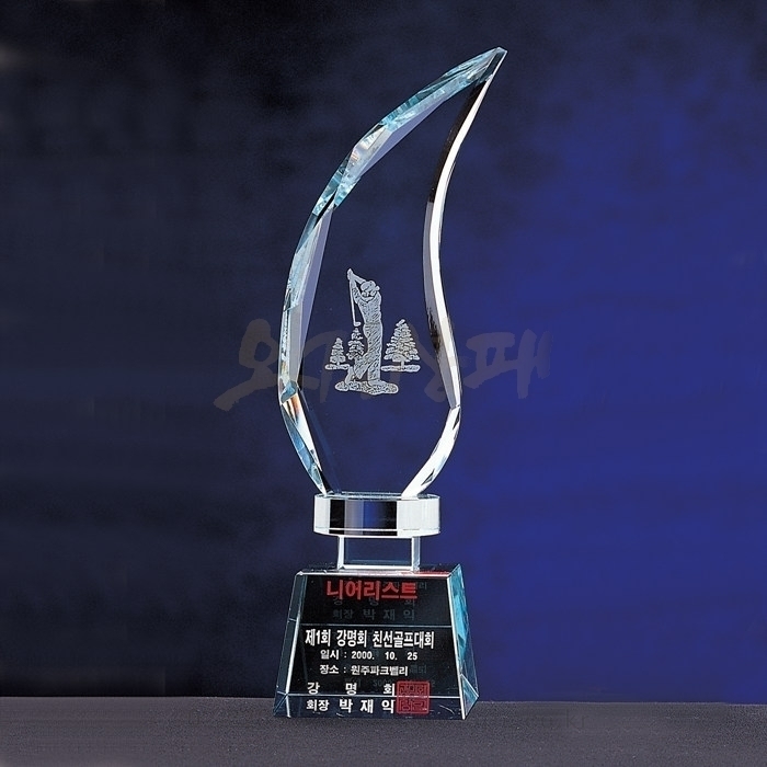 - 나뭇잎모양의 크리스탈에 골프스윙모션 샌딩처리.
