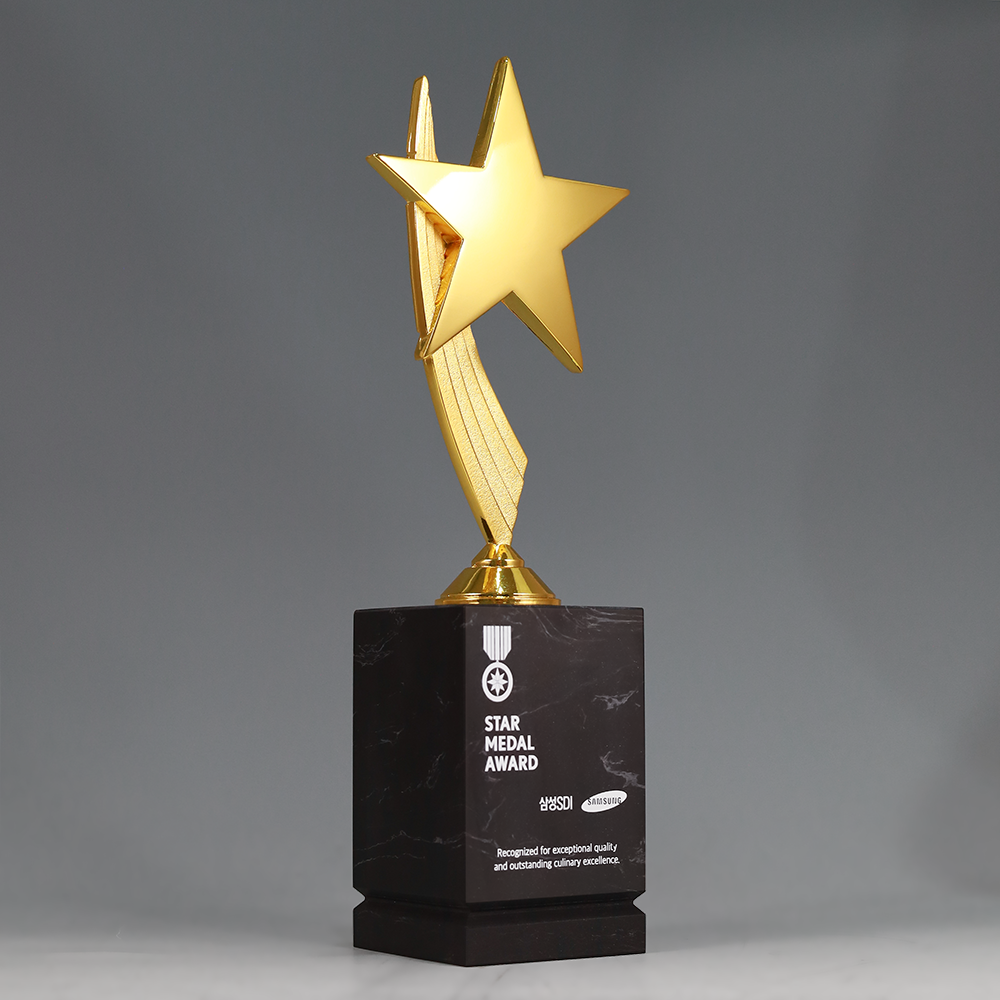 유니크한 별 조형의 상단부와 고급스러운 블랙 천연대리석 베이스가 조합된 디자인으로, 시상식 트로피 및 스포츠 트로피 제작에 적합한 금색, 은색, 동색 트로피시리즈 입니다.