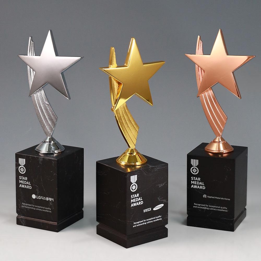 유니크한 별 조형의 상단부와 고급스러운 블랙 천연대리석 베이스가 조합된 디자인으로, 시상식 트로피 및 스포츠 트로피 제작에 적합한 금색, 은색, 동색 트로피시리즈 입니다.